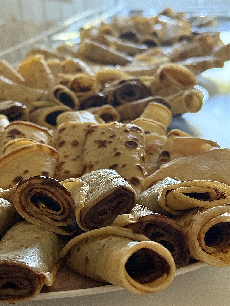 Eric's Papa, ein Franzose, hat für uns Crêpes vorbereitet und wir dürfen sie nach Lust und Laune bestreichen und zur Jause gemeinsam genießen.